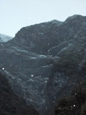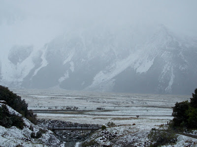 Back in our room, I packed my panniers and sorted my gear for a quick getaway in the morning.  Our bus was arriving at about 10am, and I was keen to be totally ready to get out of there.  I hopped into bed, with the snow was still falling heavily outside.  As with the night before, I pulled my blanket up over my head and tried to sleep.  That hostel was so noisy, I could hear every conversation and sound through the whole place it seemed.  Coming to Mt Cook had been a last minute addition to the tour, when I suddenly had a few extra days up my sleeve due to a flight change.  Lying there under my covers, I was pretty sure I hated the place - it looked like a beautiful paradise, but seemed all strangely wrong and sterile.  In hindsight, I still don't like the place - I concede that Mt Cook and I got off on the wrong foot with the weather and everything else, but my mind is made up.  Still, I'm glad I went there, I certainly had some insights about myself that will no doubt benefit me at some point in my life.