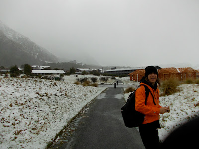 Jer seemed in higher spirits after a bit of a chance to unwind.  I was feeling a lot better too, now that we were both back in the same location.  The weather appeared to be unchanging - heavy grey skies with constant wet snow.  It wasn't the most appealing conditions to be out running around - I hadn't bargained on it snowing at Mt Cook in November, so we were hardly prepared in terms of our clothing.  Still, Jer had never seen snow before, so we wandered out into the cold to see what it was all about.