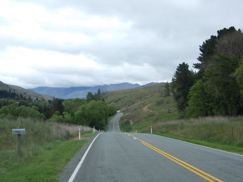 We pushed off into a light drizzle, and after about two minutes of riding the rain stopped and we rode along, with the grimy spray from the road soaking our legs.  Leaving Geraldine we entered the foothills, the road becoming progressively more rolling, eventually leading into an ongoing series of moderate ascents and descents.  We were sweltering in our heavy riding gear, which we had set up to withstand an arctic blast, and soon stopped to remove all but our rain shells.  As the hills got progressively larger, I noticed Jer was standing up on the bike and really attacking every climb, which seemed a bit unusual, but I figured he must be feeling better.  After a little while of pushing slowly uphill into the grey morning, we stopped for a bite to eat by a small creek.
