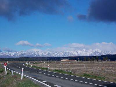 At the top of Burkes Pass the scenery changed dramatically, to a sparse and mostly treeless alpine plain, covered with tussocky grass.  Large snow capped mountains loomed in the distance, much larger and more imposing than the ones we had encountered a few days earlier.  The weather changed too - with the temperature dropping, the wind picking up and the occasional large drop of rain falling on us.  Two things were clear - a storm was rolling in, and Jer was by now completely shattered.  I wasn't feeling too bright myself, from a combination of fatigue and anxiety, and we still had at least an hour to ride until we reached Lake Tekapo.  I assumed the lead, pulled my best Jens Voigt face, and punched into the wind all the way into Lake Tekapo.  Jer grimly tucked in close behind, and neither of us said a word until we arrived at our destination around an hour later.