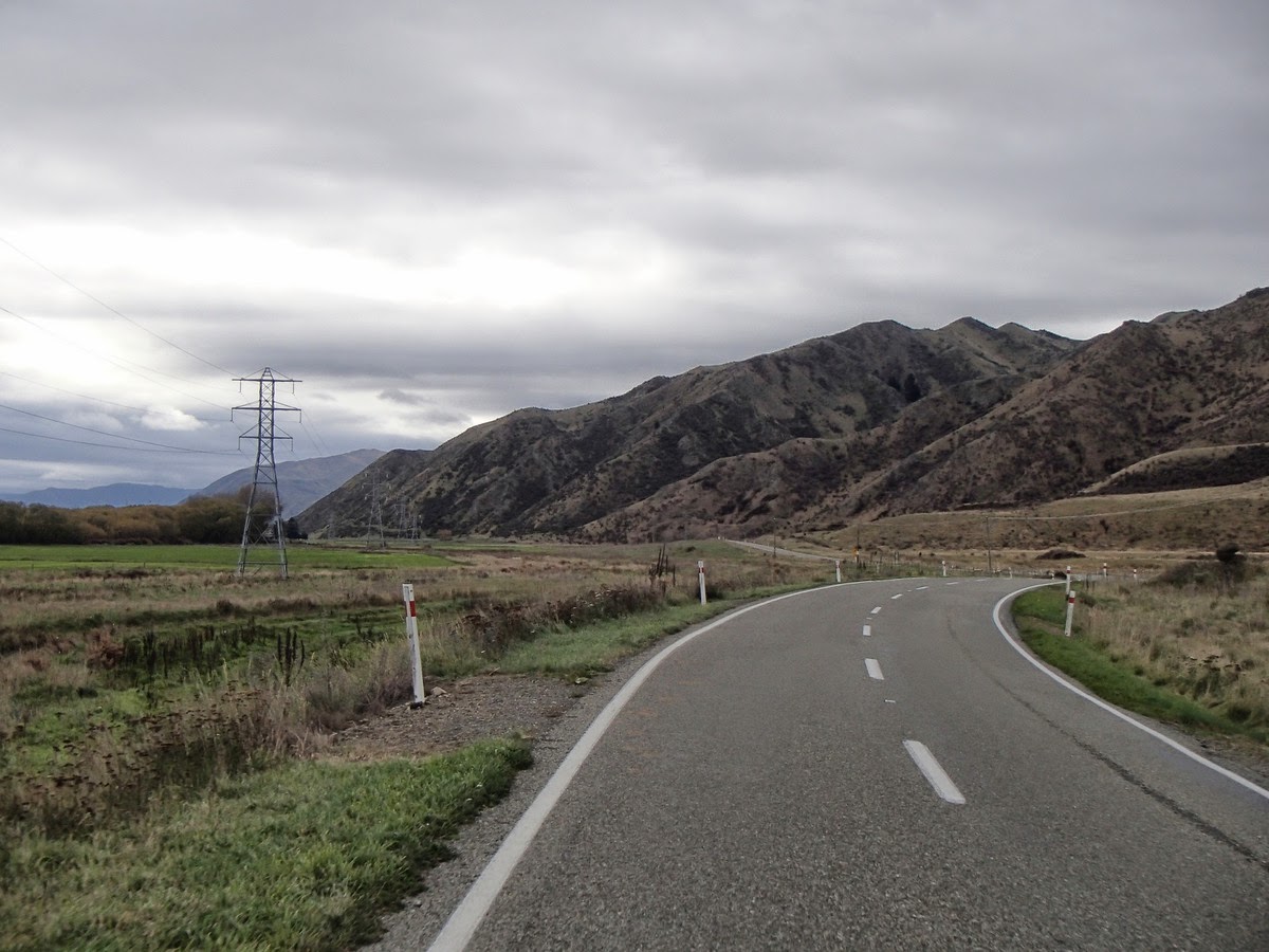 After packing up and chatting to a bloke who was walking around NZ, we rode back to the main street and turned towards Kurow, our destination for the day. I couldn't find much information about the route ahead - I knew there were no town, and no shops. As far as I could tell the northern side of the Waitaki Valley was rarely ridden by touring cyclists. Within a few turns of the pedals we left Waimate behind, and rode immediately into a winding gorge. The clouds closed in and the wind picked up, however I had trouble riding quickly. My right knee suddenly became extremely sore when I hopped back on the bike, so I happily dawdled along through the rolling countryside knowing that even at a slow pace I'd only be on the bike for a few hours.
